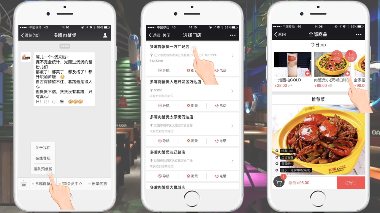 多嘴肉蟹煲,“直营店+加盟店”的经营模式,单店经营面积300㎡左右,人均消费50-60元区间,直营店主推线上微信点餐系统,通过微信平台对接天财商龙餐饮连锁管理系统,将消费“肉蟹煲”的点餐环节转移到线上来,从而开启线上点餐、线下体验的智慧餐厅新模式。