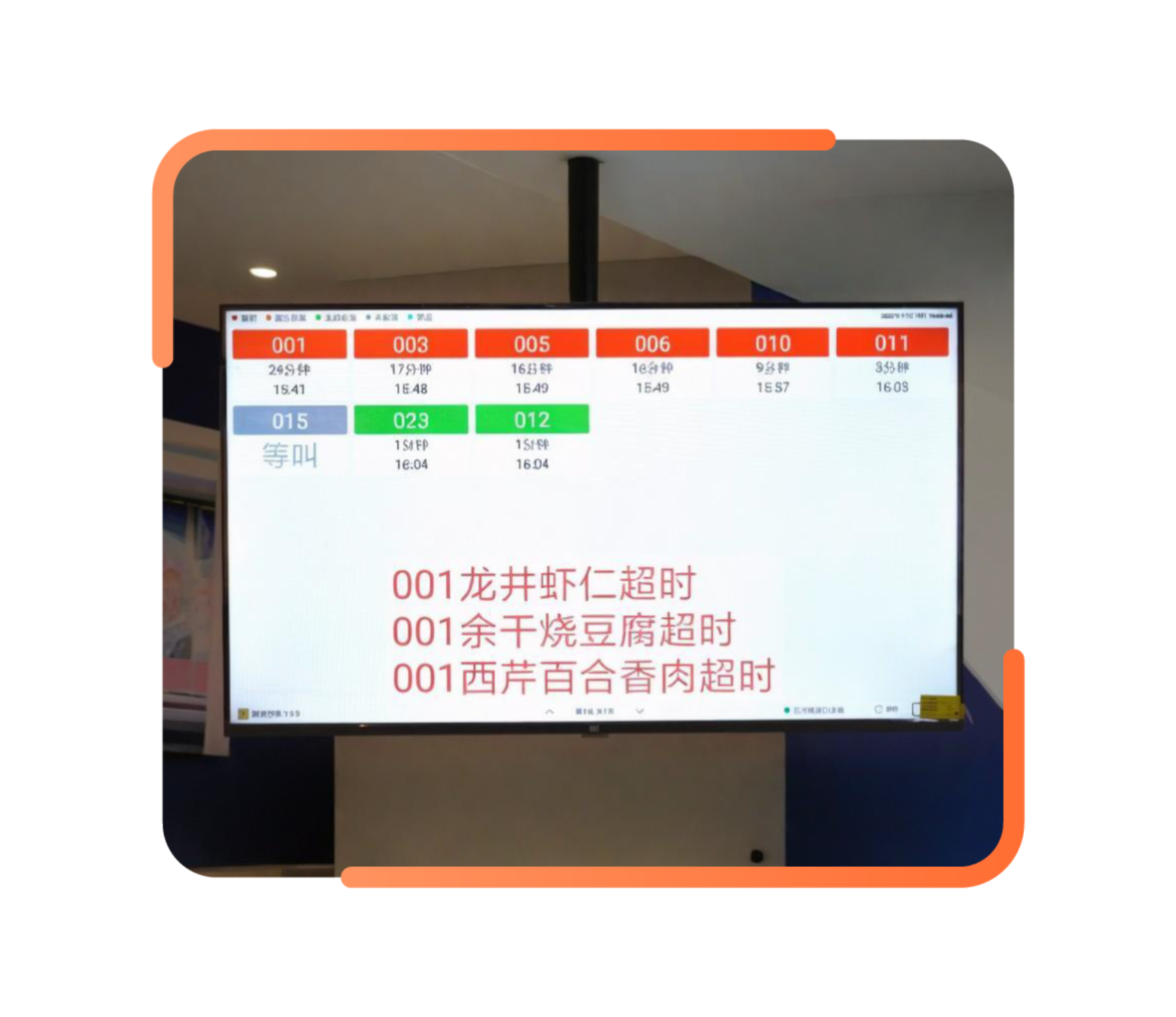 厨房での料理管理: 智能中継+管理大型画面、フロントと厨房のリアルタイム連動、状態同期