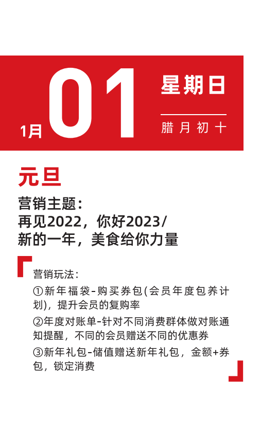 把握全年61个营销节点,梳理190个丰富的营销玩法,例如元旦、春节等中国传统节日,小雨、春分等中国24节气,女神节、520等网络节日,万圣节、圣诞节等国际节日全部涵盖,提供餐饮人更多营销思路,提前规划,把握节点,创造营收。