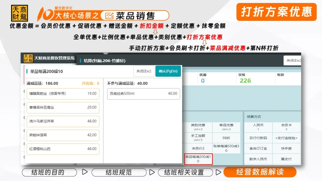 手工定额(手动抹零)、账单满减优惠(注意与菜品优惠不同,账单满减主要指超过账单金额执行优惠,比如每满500减30)、线上优惠(设置好后,系统会自动执行,包括会员价和满立减、线上促销价、线上第N杯打折)