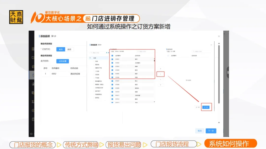 于老师在课程上,按步骤讲解了使用天财商龙供应链管理系统进行报货的流程,同时特别强调了要注意以下几点: