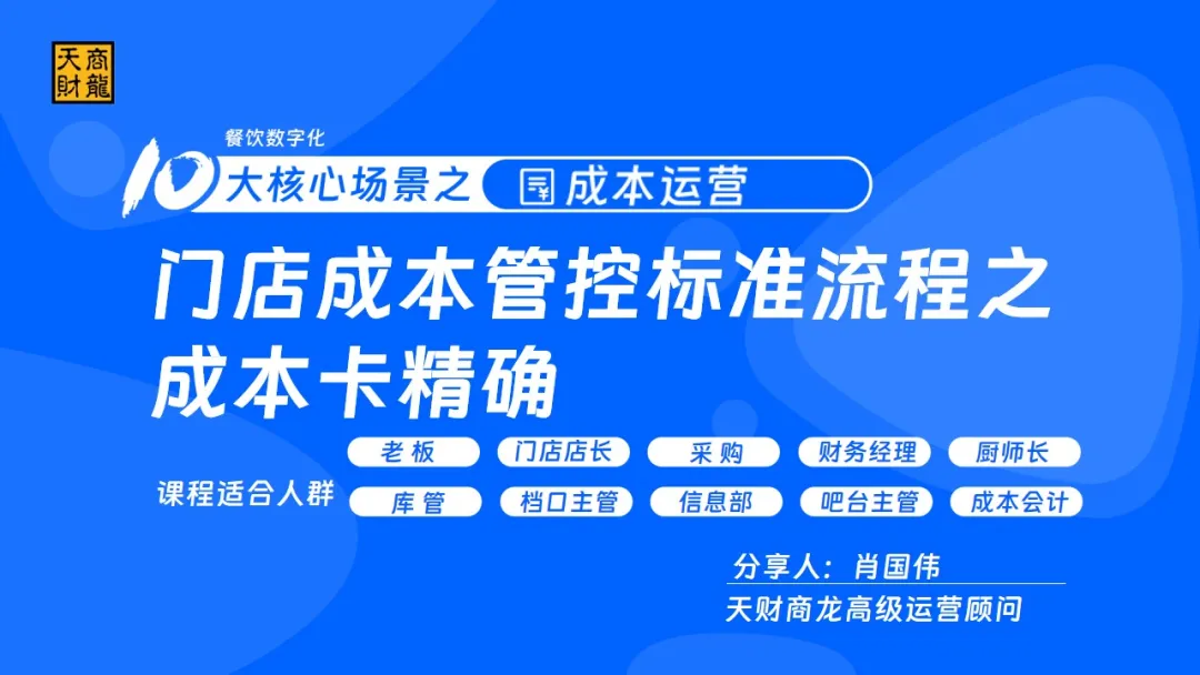 本次天财商龙10大核心场景系列课程,拥有17年餐饮成本运营落地经验的肖国伟老师,为餐饮人带来成本运营及成本卡相关内容的课程。