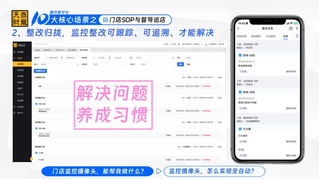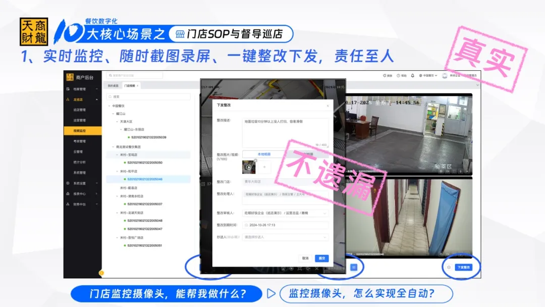 之前督导发现门店门店问题,得先拍照、记位置、打电话或用微信通知店长;现在通过天财商龙龙巡店,打开门店视频就能实时查看,看到问题直接截图录屏,一键下发整改任务,还能指定整改人、审核人,并且可以设置整改到期时间并发送提醒。