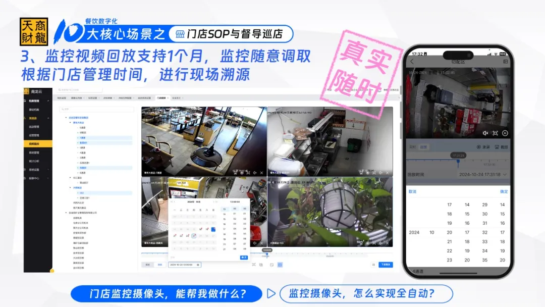 比如顾客投诉“10月24日傍晚在靠窗区吃到异物”,店长不用翻遍硬盘找录像,天财商龙系统支持按时间、按区域(比如靠窗玻璃过道用餐区、厨房操作台)精准调取。