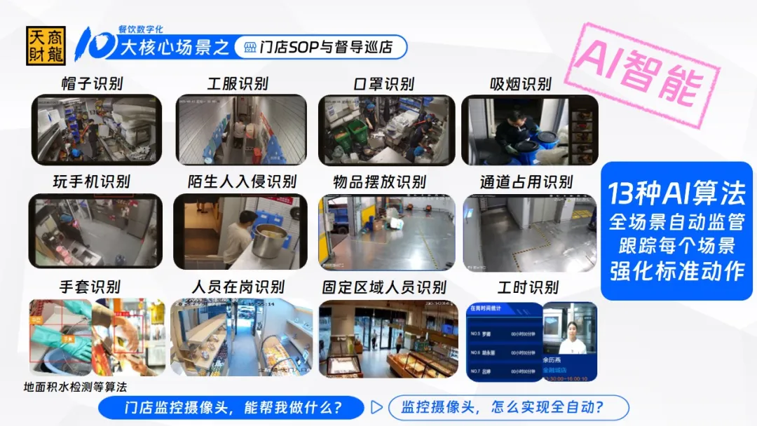 很多餐饮人觉得,门店装摄像头无非是“出事了调录像”,但天财商龙把摄像头的价值拉到了新高度——它能从“被动记录”变成“主动干活”,解决餐饮巡检的5大核心痛点。
