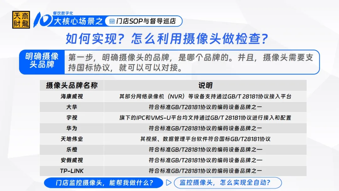 作为深耕餐饮数字化多年的服务商,天财商龙基于餐饮数字化10大核心场景,推出了“智能监控巡检系统”——让门店里的摄像头不再只是“录像工具”,而是变成能主动发现问题、跟踪整改、预警风险的“24小时督导员”。今天就由天财商龙高级运营经理王雅楠带来详细讲解。