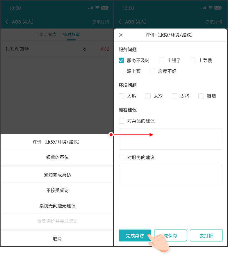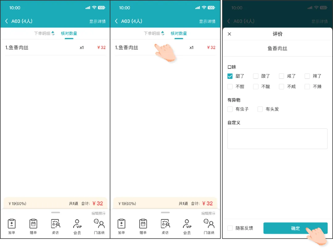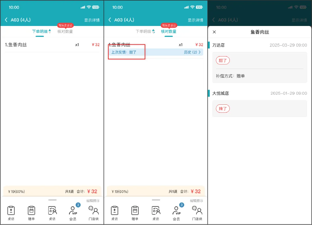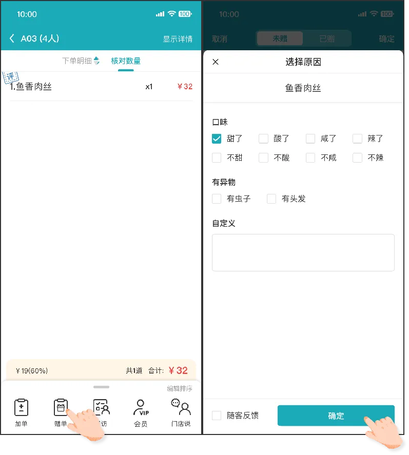 当消费者对菜品提出不满时,服务员可通过移动银台 Pro 的 “下单明细 - 核对数量” 功能,直接点击有问题的菜品进行评价记录,评价维度涵盖口味、异物及自定义选项,确保精准记录问题原因。若问题需通过赠单补偿,可直接在系统内操作赠单,且赠单原因自动关联菜品问题,无需额外手工记录,既提升处理效率,也让消费者感受到门店的诚意。