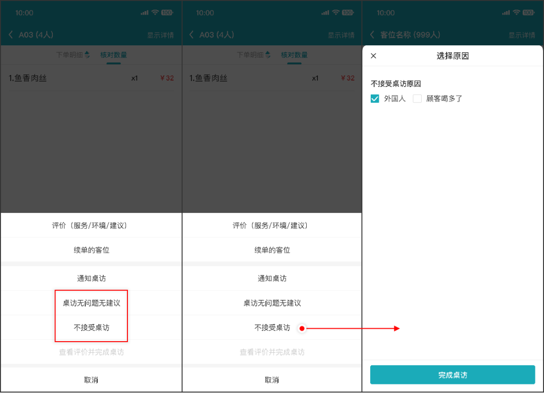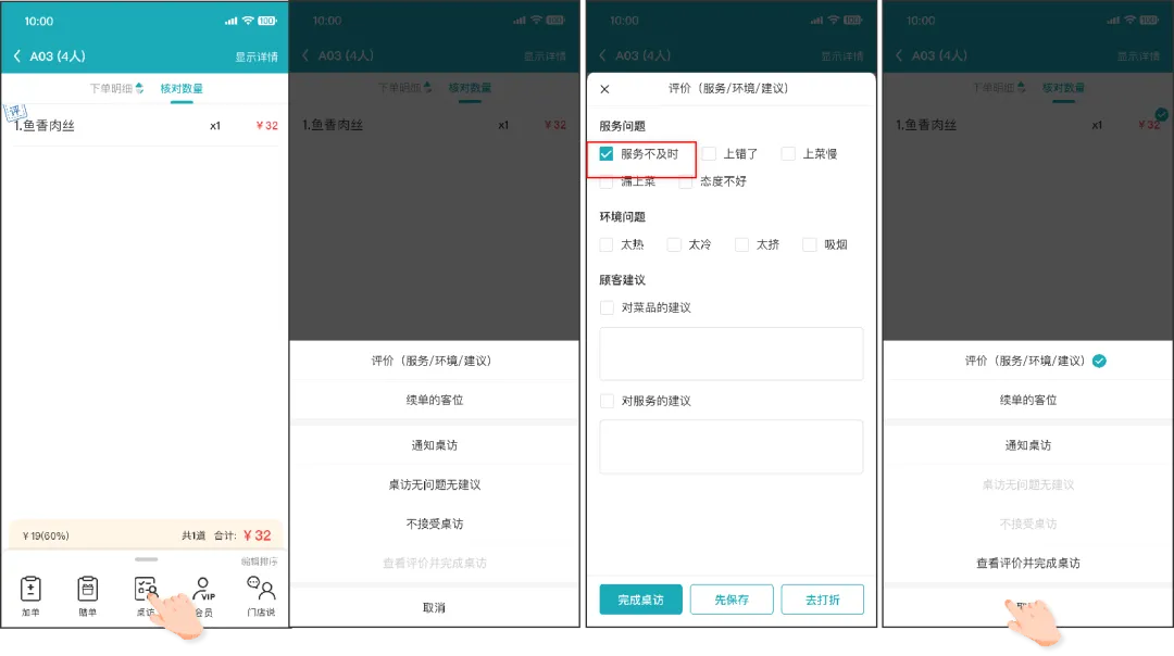 为全面收集客户反馈,门店可设置桌访任务,让桌访专员主动前往各桌询问客户体验,即使客户不接受桌访或无意反馈,也能通过系统完成记录,形成 “桌访闭环”。