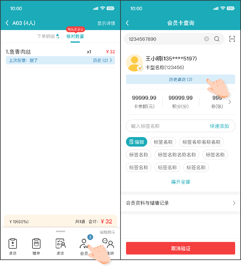 移动银台 Pro 的桌访系统支持记录会员的历史评价,当会员二次到店时,服务员可通过会员卡号或手机号查询其以往的反馈,并针对性调整服务。