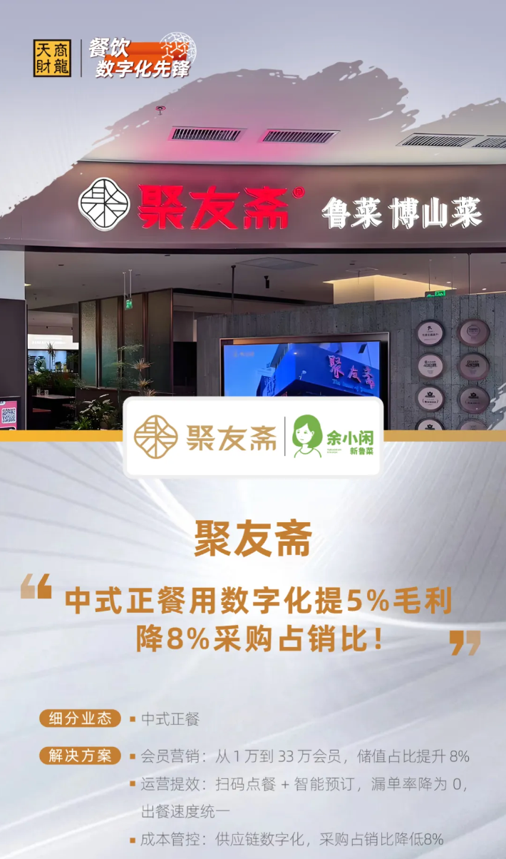 早在 2018 年,聚友斋便与天财商龙开启合作,随着门店规模扩大与消费需求升级,数字化逐渐成为其突破发展瓶颈、巩固品牌地位的关键抓手。
