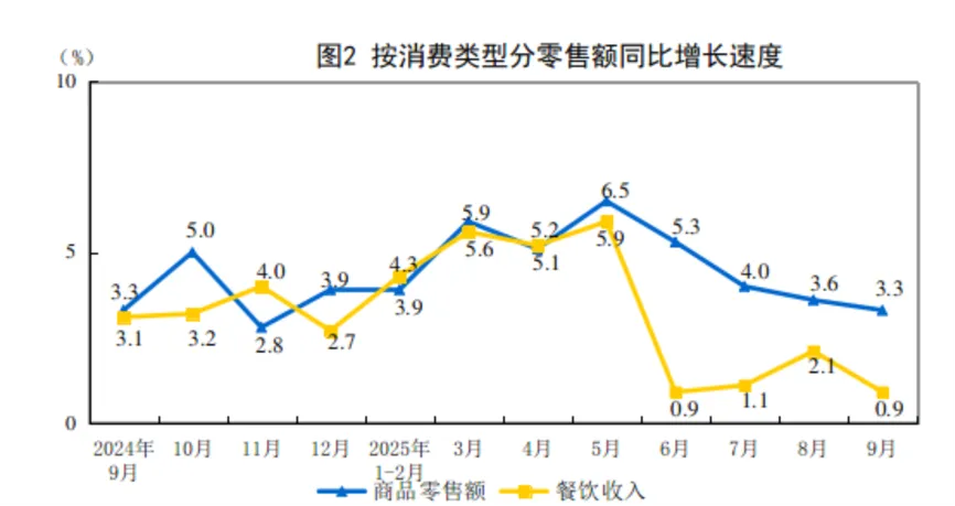 从消费结构来看,9 月商品零售额同比增速与餐饮收入增速的差距持续存在,餐饮消费的恢复节奏相对缓慢。这一方面与宏观经济下行压力下,消费者整体消费意愿趋于谨慎有关;另一方面,商务宴请、高端聚餐等传统餐饮消费场景的复苏不及预期,也对餐饮收入增速形成一定制约。