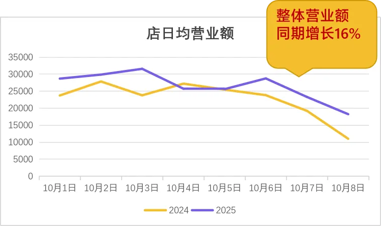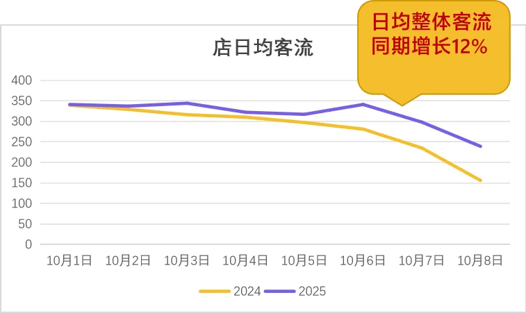 从天财商龙服务的全国 10 万 + 餐饮企业经营数据来看,双节期间的餐饮经营表现显著优于平日:整体营业额较去年同期增长 16%,日均整体客流同比增长 12%,客单价也实现 3% 的同比提升。这一组数据表明,假期消费场景下,消费者的餐饮支出意愿有所释放,且对餐饮品质的需求并未因宏观经济环境而显著降低,“愿意为好味道、好体验买单” 的消费特征依然清晰。
