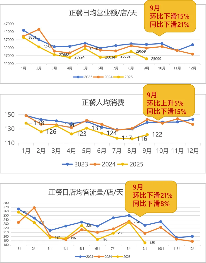 作为餐饮行业的重要组成部分,正餐业态在 9 月遭遇显著冲击。数据显示,9 月正餐业态营业额环比下滑 15%、同比下滑 21%,日均客流环比下滑 21%、同比下滑 8%,两项核心经营指标均降至 2025 年以来的最低水平;尽管人均消费环比上升 5%,但同比仍下滑 15%,未能抵消客流与营业额的下滑幅度。