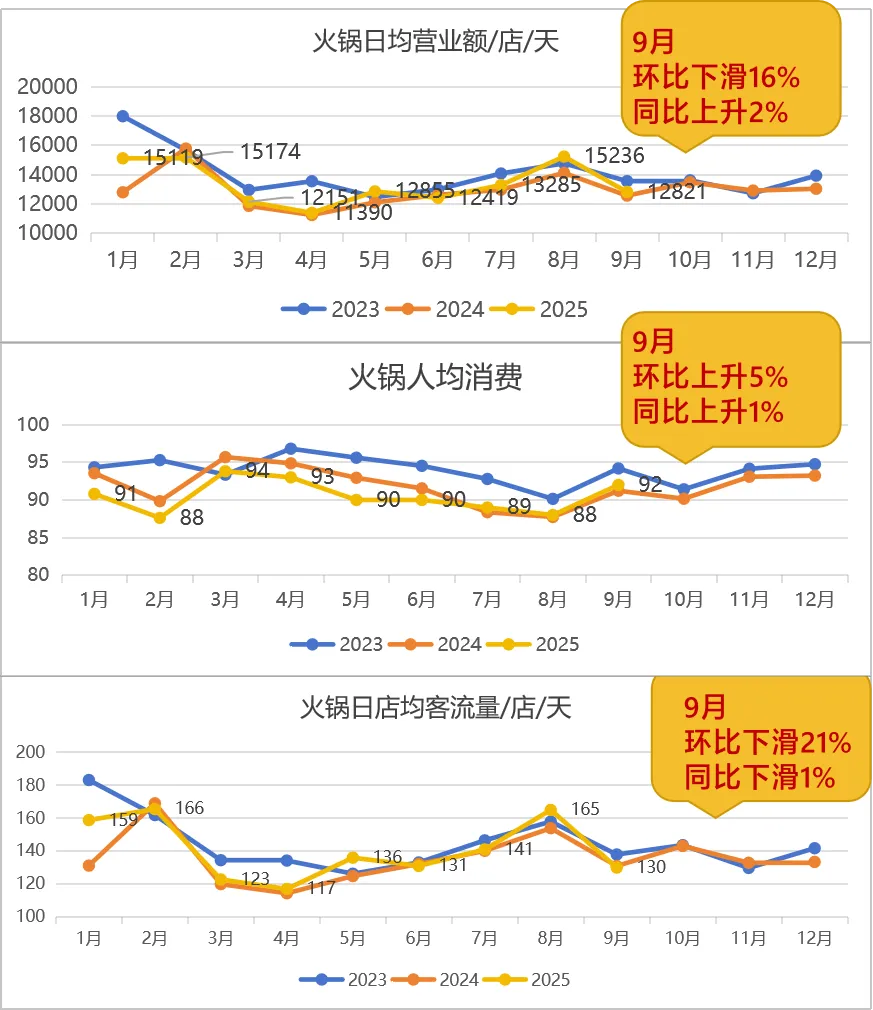 2024 年凭借 “山野火锅”“贵州酸汤火锅”“鲜切牛肉火锅” 等细分品类话题热度飙升的火锅业态,在 2025 年 9 月面临增速回落的压力。从经营数据来看,9 月火锅业态人均消费环比上升 5%、同比上升 1%,显示消费者对火锅的消费品质需求相对稳定;但日均客流环比下滑 16%,尽管同比仍上升 2%,但客流增长幅度已无法支撑营业额的快速提升,最终导致火锅业态营业额环比下滑 21%、同比下滑 1%,基本回归至往年同期水平。