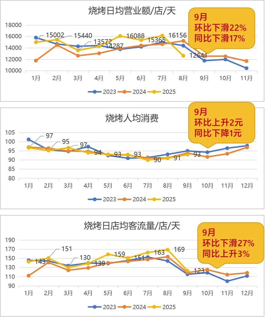 凭借强社交属性和高性价比,烧烤业态在 2025 年暑期曾展现出较强的增长活力,但随着暑期结束,9 月经营情况急转直下。数据显示,9 月烧烤业态营业额环比下滑 22%、同比下滑 17%,日均客流环比下滑 27%,尽管同比仍上升 3%,但相较于暑期的高增速已大幅回落;人均消费环比上升 2 元,同比却下降 1 元,反映出消费者对烧烤的消费支出趋于理性。