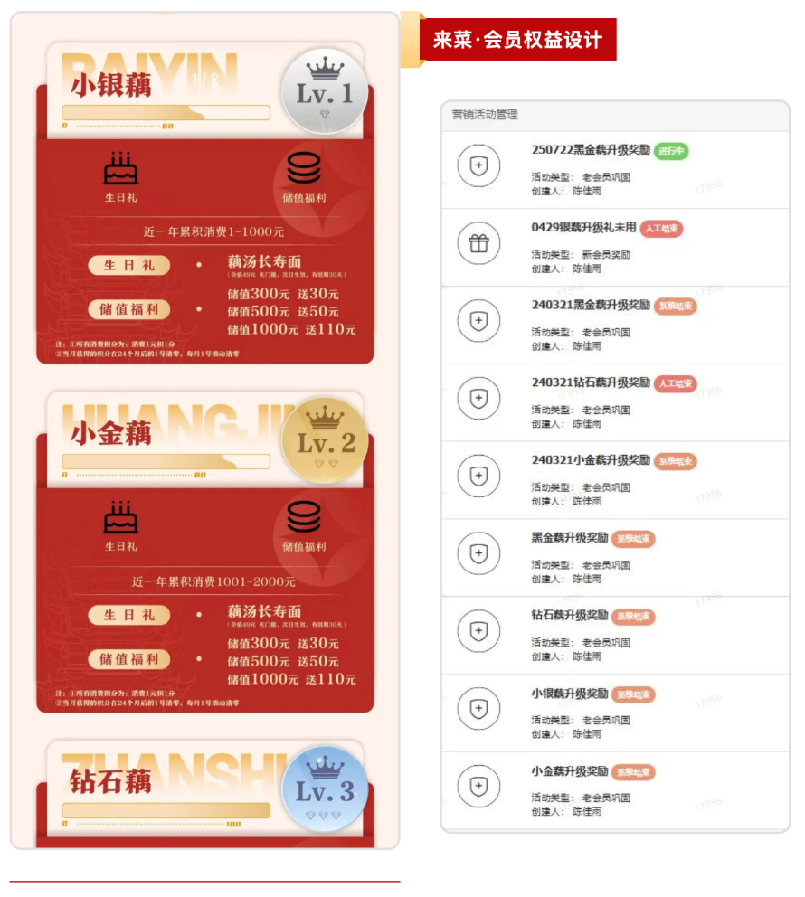 会员权益分层:转型前,来菜会员仅通过 “充值送赠金” 回馈顾客,无等级权益区分,高价值用户的个性化体验需求难以满足。合作后,双方共同搭建会员体系 3.0,划分小银藕、小金藕、黑金、钻石藕等 5 个卡型,设置差异化升级门槛与权益,从基础优惠到专属服务,让不同消费层级的顾客都能感受到 “被重视”