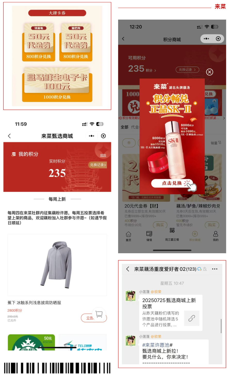 • 丰富的兑换产品+社群联动:在积分商城增加了星巴克 50 元代金券、SK-II 产品、盒马鲜生电子卡等大牌商品兑换,同时保留菜品券、品牌周边兑换,进一步为顾客提供更丰富的选择,同时在社群开展 “500 积分兑 100 枚游戏币”“许愿池选品” 等活动,邀请顾客投票决定积分商城上新品类,让顾客从 “被动接受” 变为 “主动参与”,体验感大幅提升。