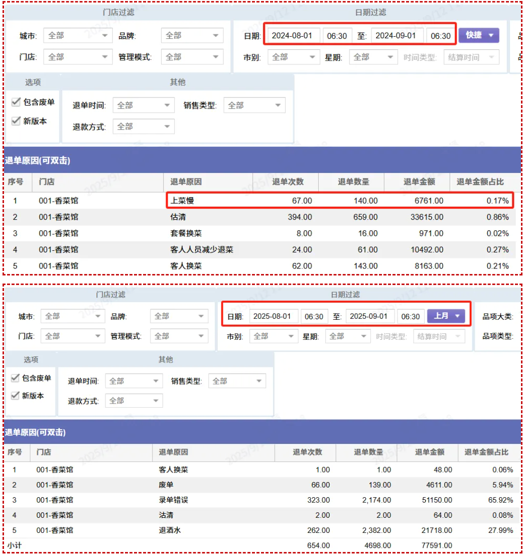 顾客体验与口碑显著改善:“上菜慢” 导致的退单与菜品沽清退单均有显著降低,上菜慢投诉降低 90%,线上好评占比显著提升,散客 “不满意离店” 现象基本消失。