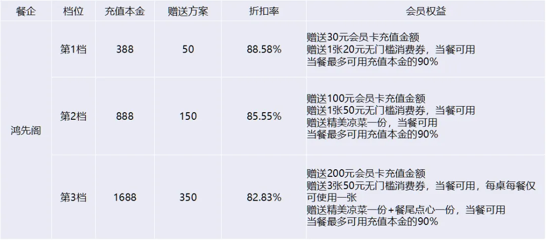 1、为了降低顾客首次充值的门槛,鸿先阁构建了三个不同档次的储值体系,并且融入智能小微储值体系,鼓励更多顾客能够轻松参与进来。