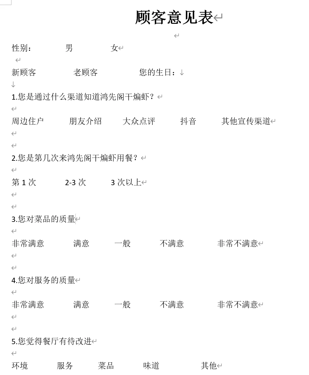 △ 鸿先阁·干煸虾顾客意见表