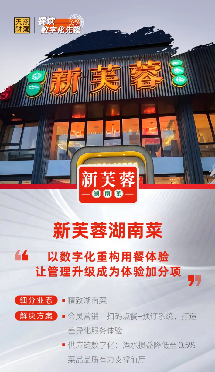 特别是天财商龙的云化系统无需额外购置硬件,更适配多门店统一管理,既能实现前端服务与后端供应链数据打通,又具备本地化服务响应能力,可根据门店实际需求灵活调整,完美匹配新芙蓉“以体验为核心、兼顾管理效率与供应链支撑” 的转型目标。