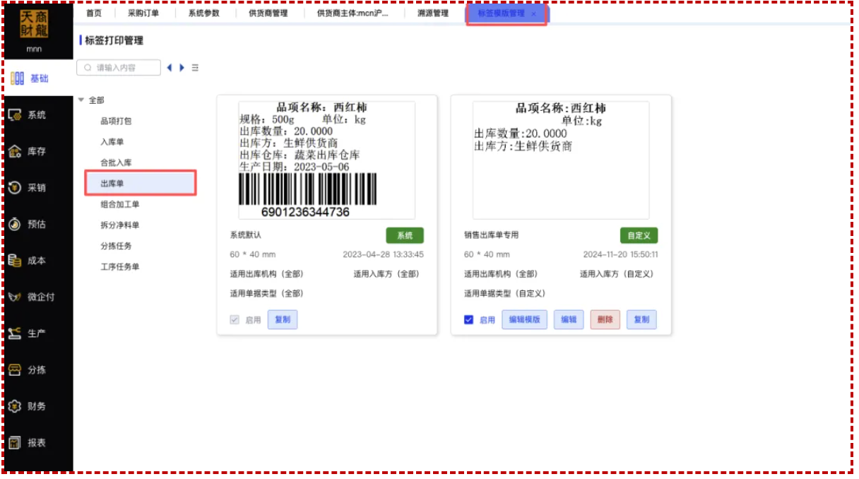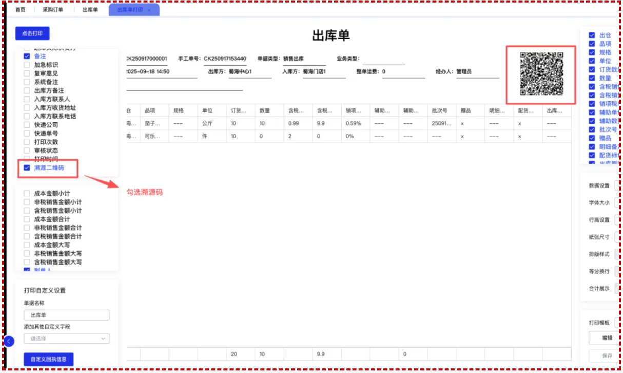 · 第五步:出库单打印溯源二维码——赋予食材标识。