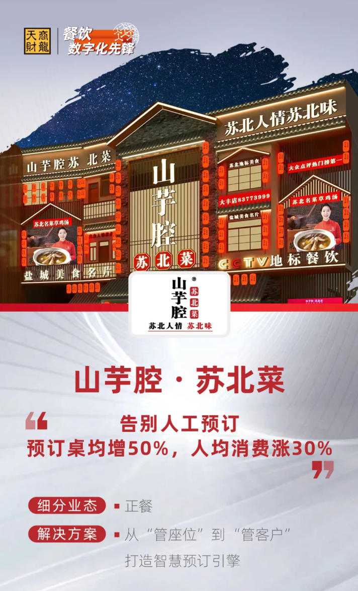 从传统人工预订到智慧预订生态的转型,山芋腔・苏北菜用数字化手段重塑了中高端正餐的服务标准与运营逻辑。此次与天财商龙的深度合作,不仅解决了品牌的即时痛点,更构建了 “数据驱动运营、服务打动客户” 的长期竞争力。