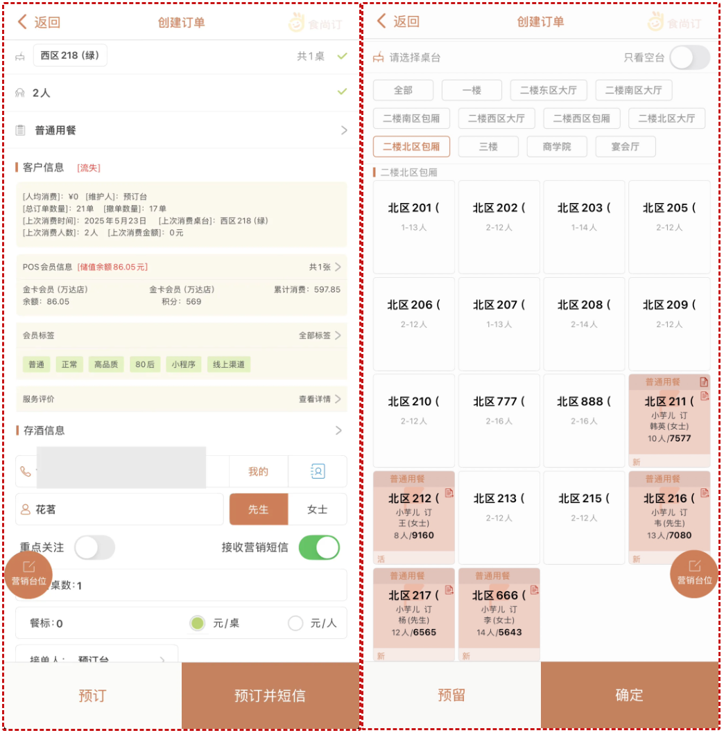 全流程自动化:天财商龙为山芋腔部署的智能预订管理系统,实现了预订与餐饮服务、会员数据的无缝对接。系统支持移动端自主预订功能,顾客仅需“选门店→填人数 / 时段 / 座位偏好→提交确认” 3步即可完成操作,大幅提升预订效率,系统自动发送预订成功短信,并提供 “取消 / 修改预订” 快捷入口。同时,实现来电弹窗显示客户信息,提升人工预订响应效率。