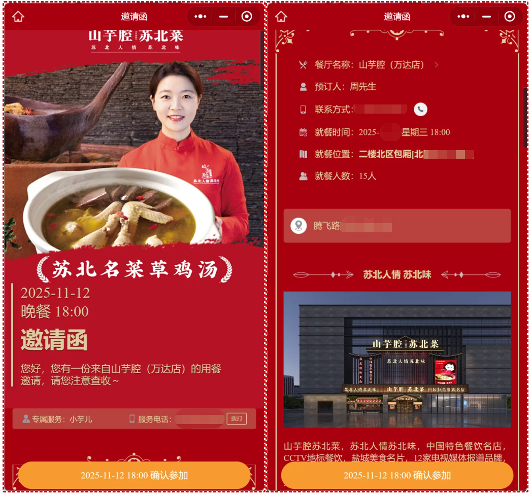 定制化邀请函:品牌可上传专属素材打造品牌个性化邀请函,并结合顾客预订偏好,如“您常选的靠窗座位已预留,点击预订”进行推送,提升顾客满意度与复购率。并且系统自动记录 “邀请函点击量 - 预订转化率 - 到店消费率” 全链路数据,为后续营销活动优化提供依据。