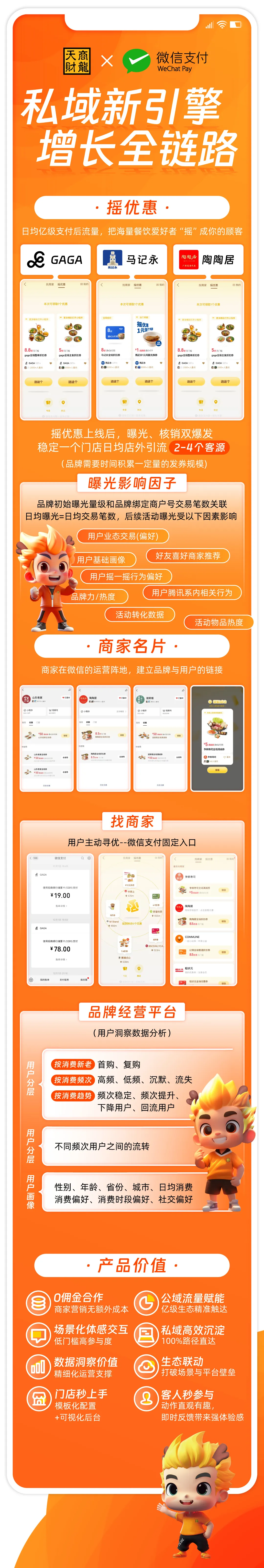 作为深耕餐饮数字化多年的服务商,天财商龙携手微信支付推出“私域新引擎”全域经营方案,用成熟的系统能力+精准的流量玩法,帮商家把支付场景变成获客入口、把公域流量转化为私域流量。
