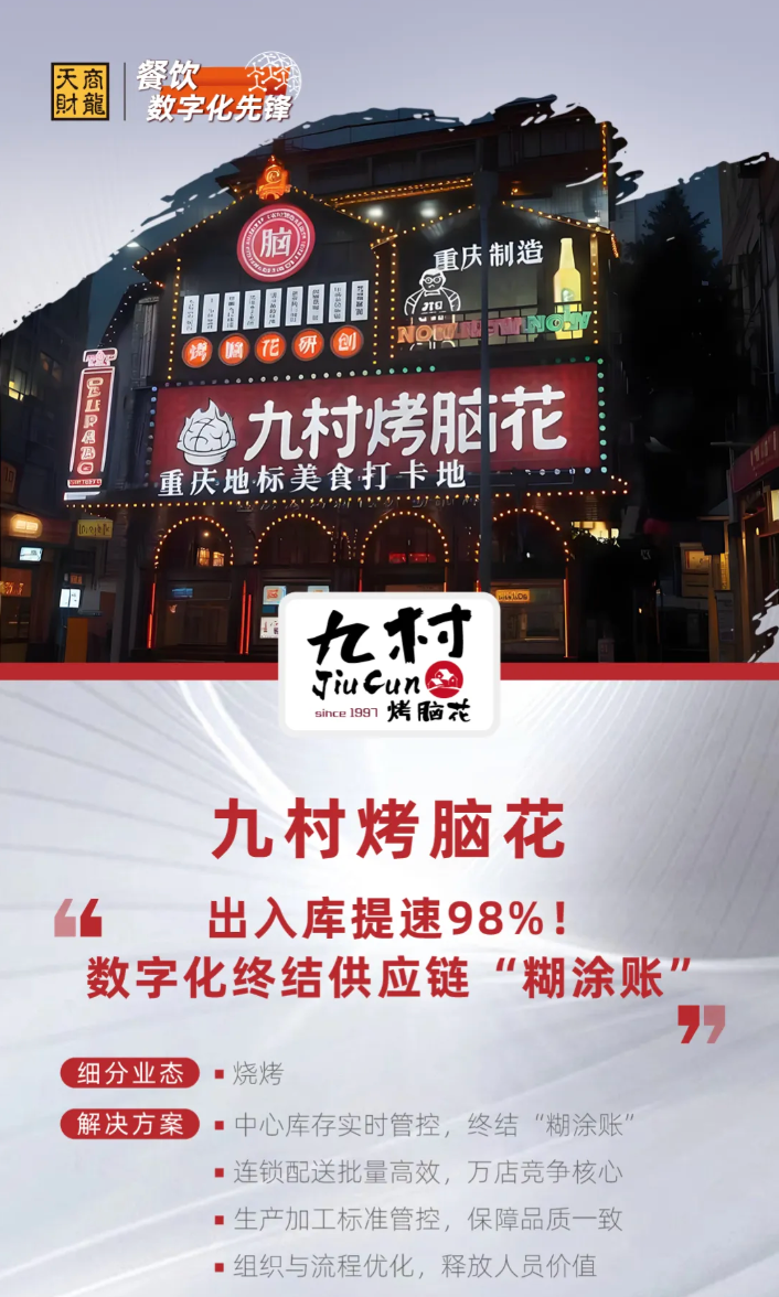 A2:天财商龙深耕餐饮数字化27年,具备一站式闭环解决方案能力,能够精准适配九村烤脑花“凌晨报货、鲜货加工、直营连锁”的业务特殊性,且数字化转型可针对性解决其供应链“效率低、数据乱、成本高”的核心问题。