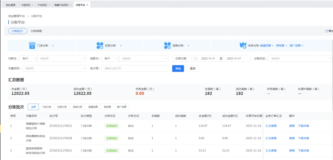 ②依托餐饮软件的稳定技术支撑,测试期间 192 笔分账全成功,零失败案例,保障资金流转安全可控。