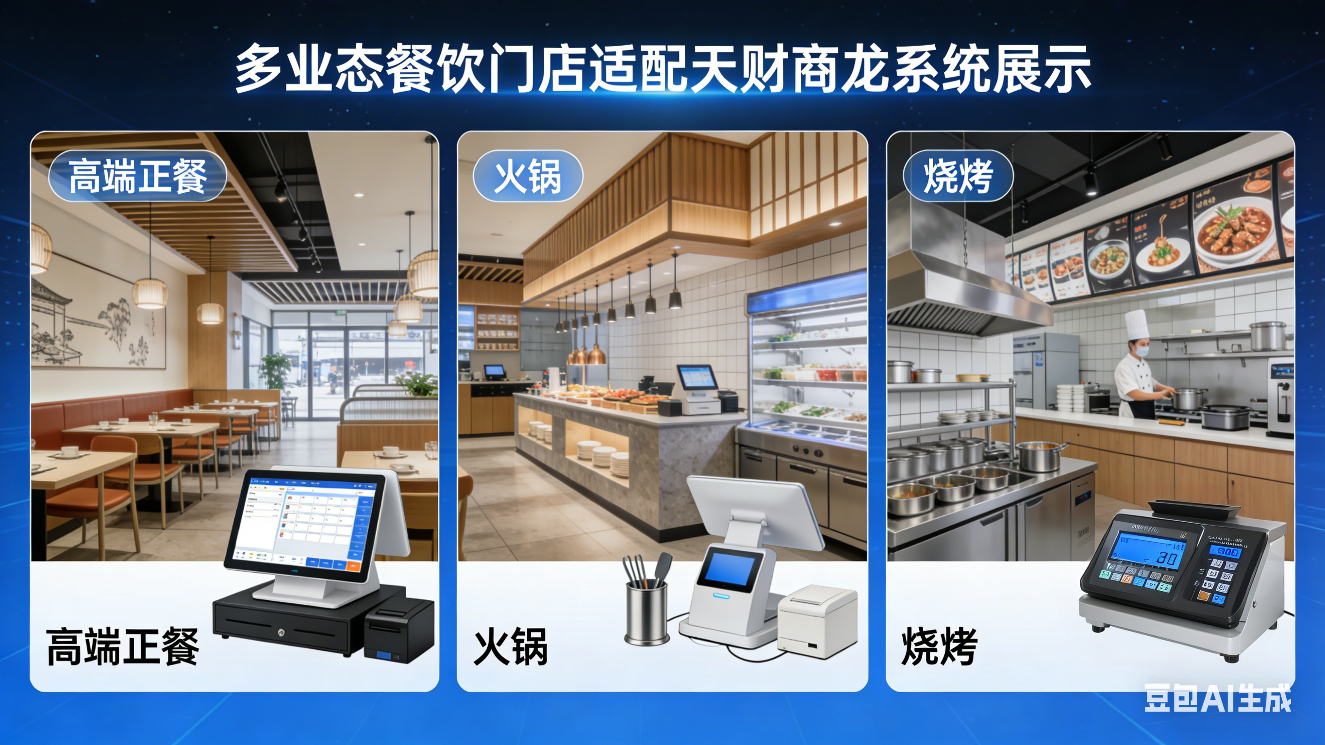 餐饮行业业态多元、需求差异化明显,天财商龙精准拿捏不同规模商家的核心痛点,凭借“弹性硬件+模块化软件”架构,打造差异化餐饮系统解决方案,实现中大型连锁与中小餐饮的全域覆盖。硬件可从单档口适配至千店连锁,软件支持功能模块按需勾选,灵活适配不同经营场景,降低商家数字化转型门槛。