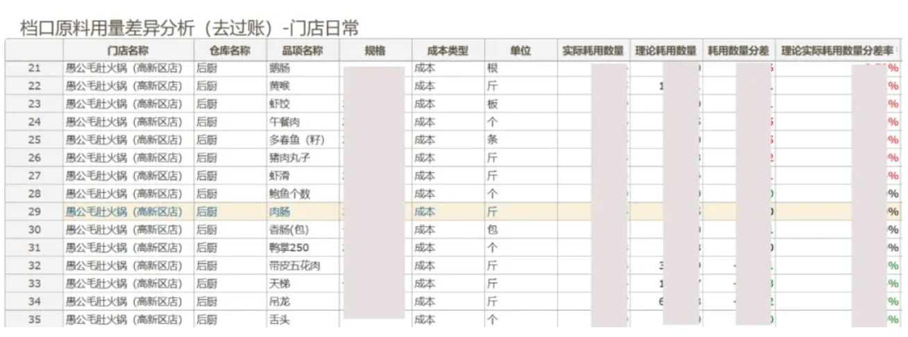 ③原料用量分差分析体系,精准追踪供货商、收货、盘点等各环节问题,让成本异常可溯可改。通过这些功能,愚公毛肚火锅各门店食材成本分差逐步缩小,菜品毛利整体提升1.5%-2%。