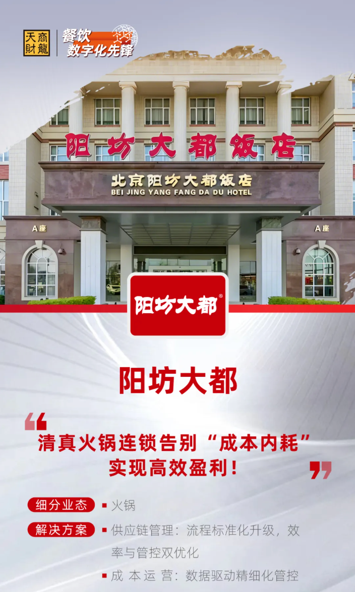 答:天财商龙“前厅-后厨-供应链-决策层”闭环系统,精准匹配阳坊大都的连锁需求:
