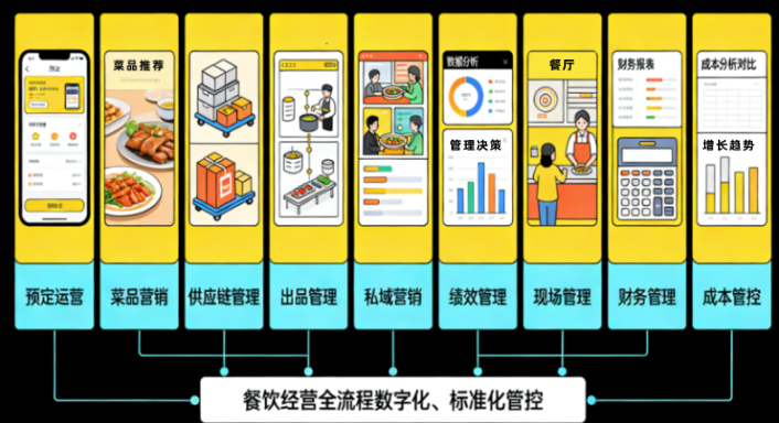 覆盖预定运营、菜品营销、供应链管理、出品管理、私域营销、管理决策、绩效管理、现场管理、财务管理、成本管控十大核心场景,依托餐饮管理软件实现餐饮经营全流程数字化、标准化管控。
