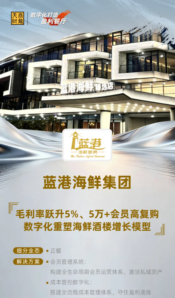 蓝港海鲜集团作为青岛老字号、华东地区高端海鲜正餐的代表性企业,在规模扩张过程中主动拥抱数字化,通过引入天财商龙餐饮管理软件,成功破解传统餐饮在会员运营、成本管控、供应链协同、连锁管理等方面的核心痛点,实现从“规模扩张”向“盈利提质”的关键跨越。
