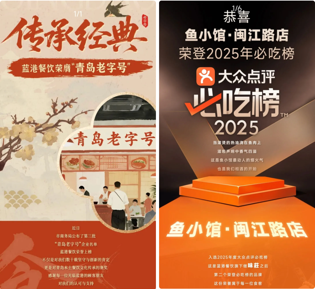 经营业态:以高端海鲜正餐为核心,主打鲜活海鲜、青岛本地特色菜、经典鲁菜,场景覆盖家庭聚餐、商务宴请、婚庆喜宴、旅游接待、团队聚会等全场景正餐需求。集团坚持“蓝港海鲜,道道领‘鲜’”的品牌理念,以食材新鲜度把控、无理由退菜服务承诺、优质用餐体验形成核心竞争力,旗下多个品牌门店先后登上大众点评必吃榜,荣获“中国餐饮百强企业”“五星级海鲜酒楼”“青岛老字号”等权威荣誉,既是本地市民日常海鲜消费首选品牌,也是外地游客体验青岛海鲜饮食文化的标志性窗口。