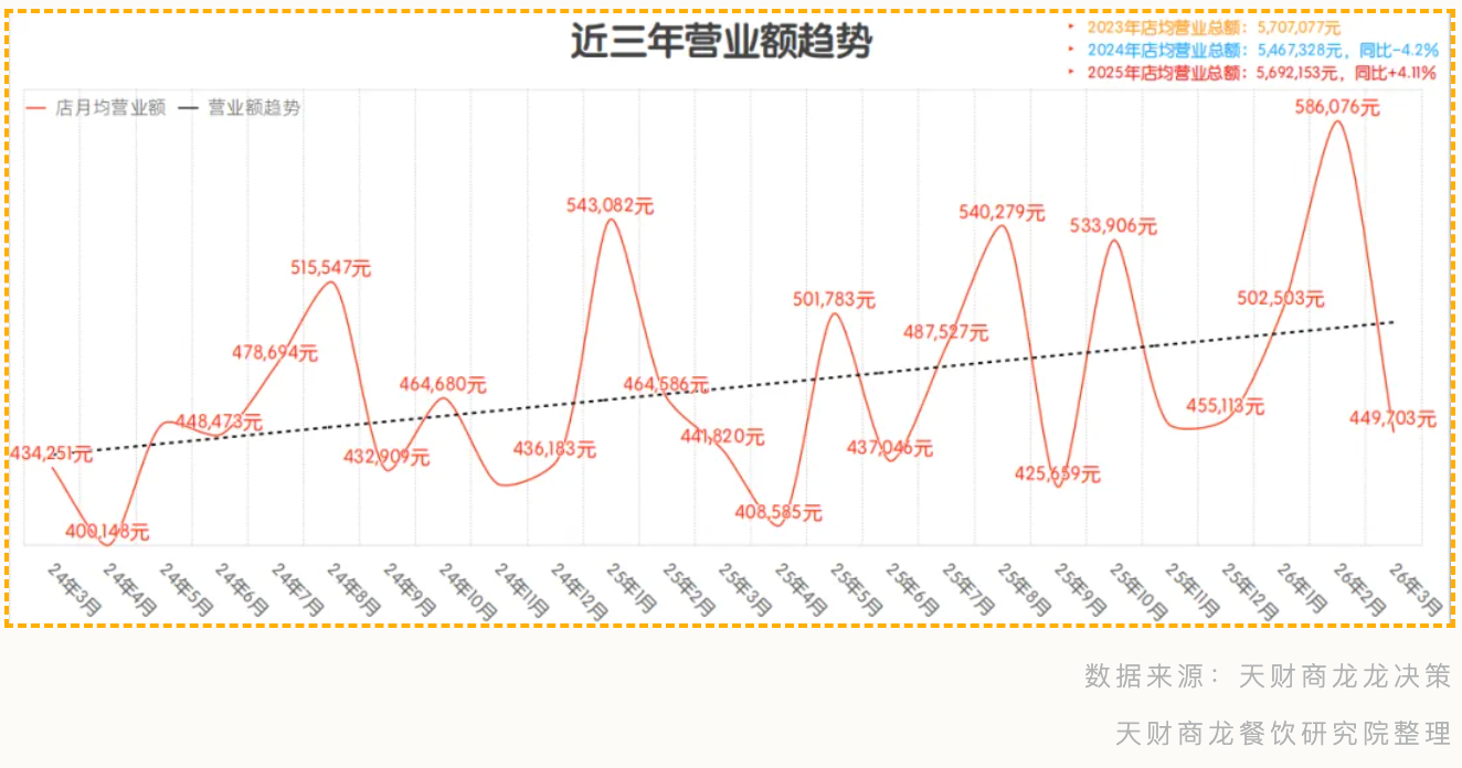 3月店均营业额44.9万元,环比2月(58.6万)下滑明显,但对比2025年同期,下降幅度小于往年。这意味着,尽管节后消费热情回落,但市场的“底部”正在被逐步抬高。
