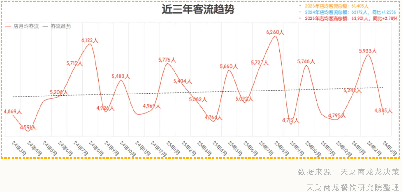 客流量变化趋势与营业额基本一致,3月店均客流4800人,环比2月(5900人)下降约20%,再次印证了3月是行业关键的“缓冲调整期”。