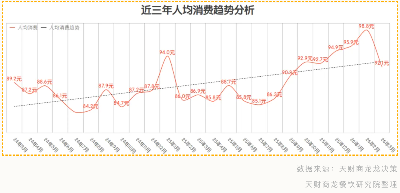 一个关键趋势浮现:人均消费持续稳步增长。3月人均消费92元,虽环比春节月的98元有所回落,但相比2024、2025年同期,呈现出清晰的逐年抬升曲线。
